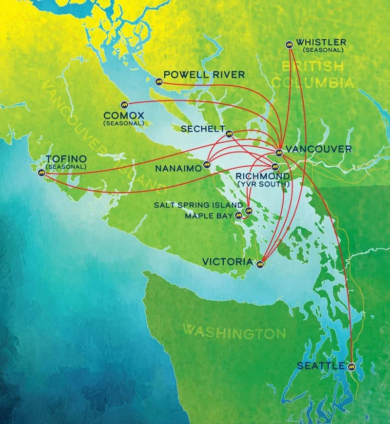 Streckennetz: Vancouver Harbour nach Victoria Harbour ist die wichtigste Strecke mit täglich bis zu 28 Flügen je Richtung. Von Vancouver nach Seattle Lake Union sowie nach Tofino verlaufen die längsten Routen, die Flugzeit beträgt jeweils 50 Minuten. Die touristischen Ziele Tofino, Comox sowie Whistler werden nur im Sommer saisonal angeflogen. Zudem umfasst das Streckennetz noch fünf weitere Ziele in der Region, darunter Richmond, gelegen unmittelbar am internationalen Flughafen von Vancouver mit Elektrobus-Shuttle zum Hauptterminal.