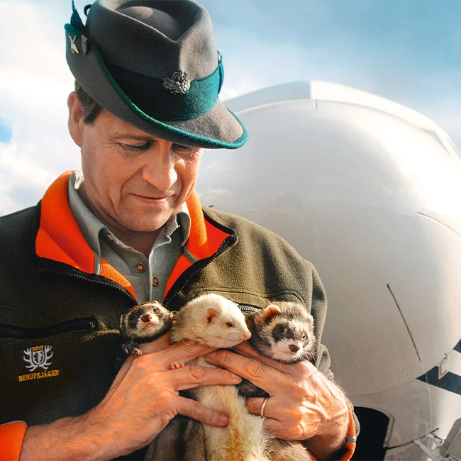 Vogelschlagprävention am Boden: Mäuse und Kaninchen, die den Flughafen bevölkern, locken Fressfeinde an. Der Iltis hilft, sie aufzustöbern und zu vertreiben.