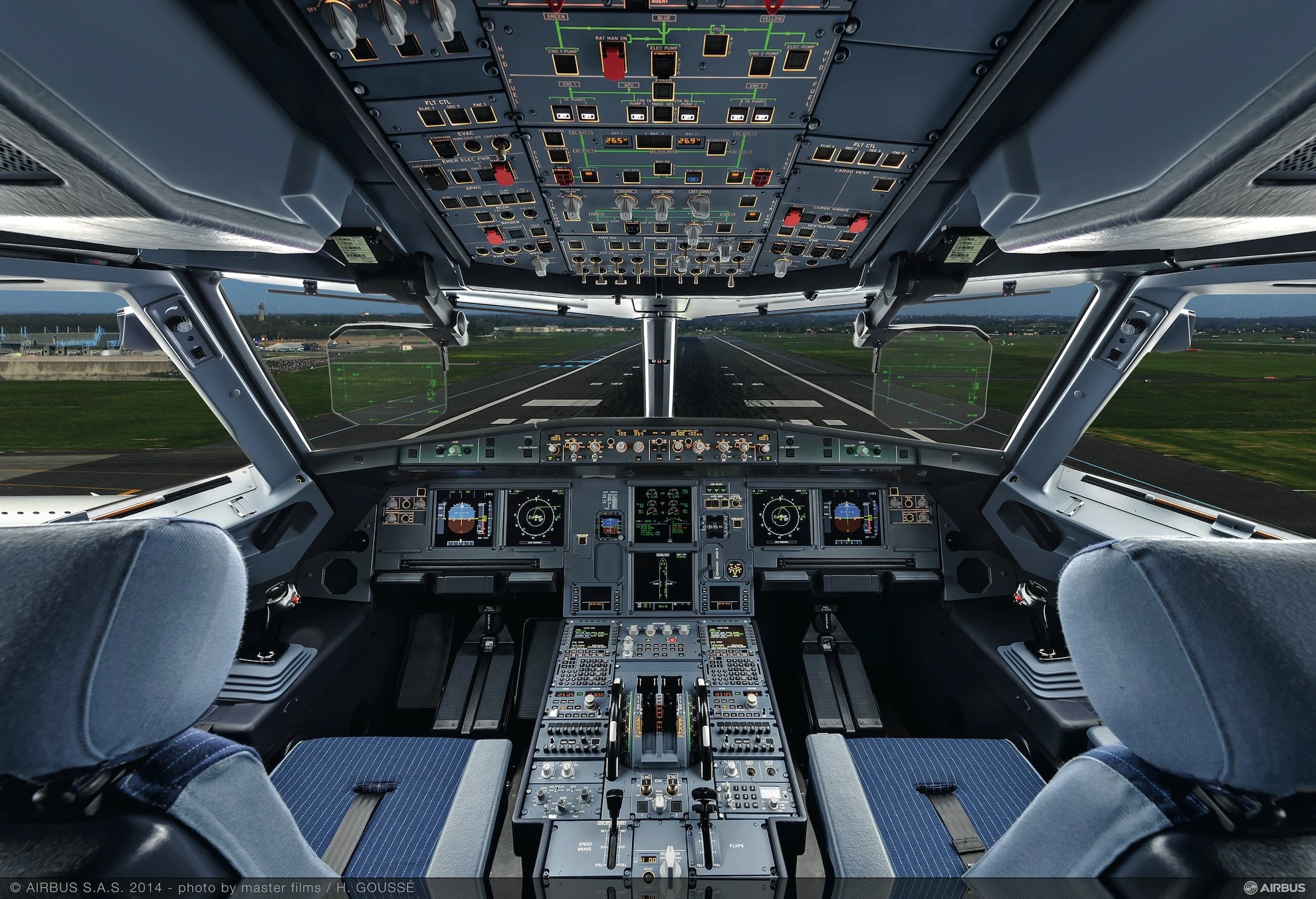 A320-Cockpit mit seitlichem Sidestick und elektronischer Fly-by-Wire-Steuerung, die präzise Kontrolle und erhöhte Betriebssicherheit ermöglicht.