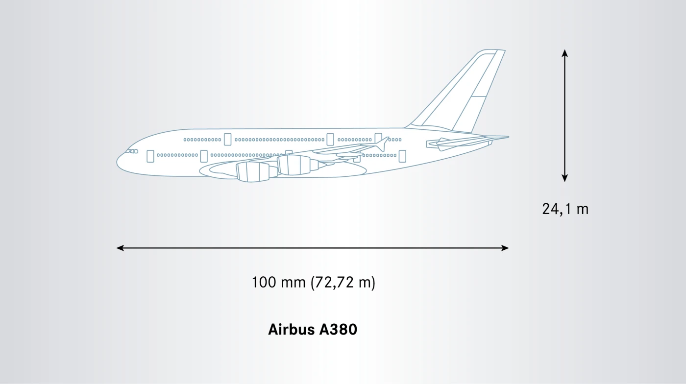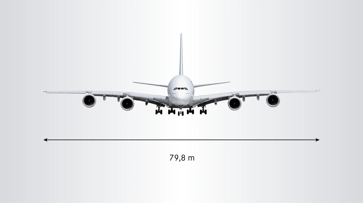 - Der Airbus A380, das größte Passagierflugzeug der Welt, beeindruckt mit einer Spannweite von 79,8 Metern, einer Länge von 72,7 Metern und einer Höhe von 24,1 Metern. Das Flugzeug ist damit so lang wie zwei Blauwale und so hoch wie fünf Giraffen. Während des Starts biegt sich der Flügel um über vier Meter nach oben.