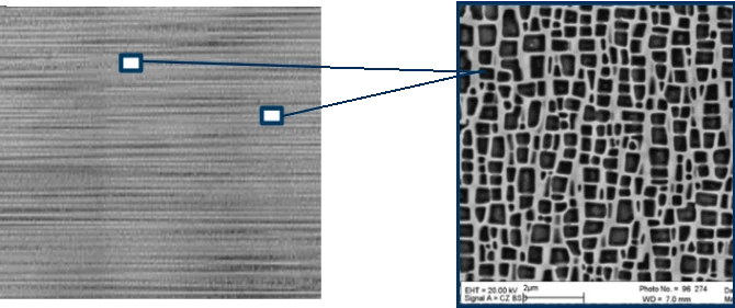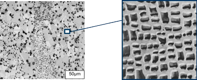 Typisches Werkstoffgefüge einer Nickelbasis-Superlegierung. Die Vergrößerung zeigt das charakteristische, mikrostrukturelle Merkmal der quaderförmigen, sogenannten γ‘-Ausscheidung, (einer intermetallischen Phase) in der metallischen γ-Matrix. Diese spezielle Struktur ermöglicht – neben Legierungszusätzen mit schweren Elementen – hohe Festigkeiten bis zu hohen Temperaturen.