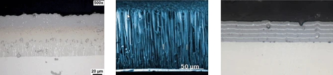 Schutzschichten in Flugtriebwerken zeichnen sich durch eine große Vielfalt der enthaltenen Werkstoffe und der Strukturen aus. Als Beispiele zeigen die Bilder links eine durch Diffusion in das Grundmaterial entstandene, aluminiumhaltige Korrosionsschutzschicht, in der Mitte eine aufgedampfte, in Stängeln gewachsene, keramische Wärmedämmschicht und rechts eine lagig aufgebrachte Erosionschutzschicht mit wechselnden harten und schadenstoleranteren Schichtanteilen.