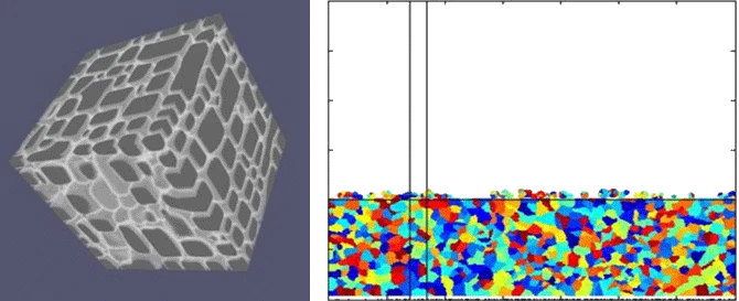 Werkstoffsimulationen dienen unter anderem der Vorhersage der Materialstruktur. Links ist das computergenerierte γ / γ‘ - Mikrogefüge eines Nickel-Basis-Einkristalls zu sehen, rechts die Entstehung einer additiv hergestellten Kornstruktur durch den senkrecht einfallenden Laserstrahl auf das Pulverbett an der Oberfläche. Die Farben kennzeichnen die verschiedenen Ausrichtungen der einkristallinen Körner.