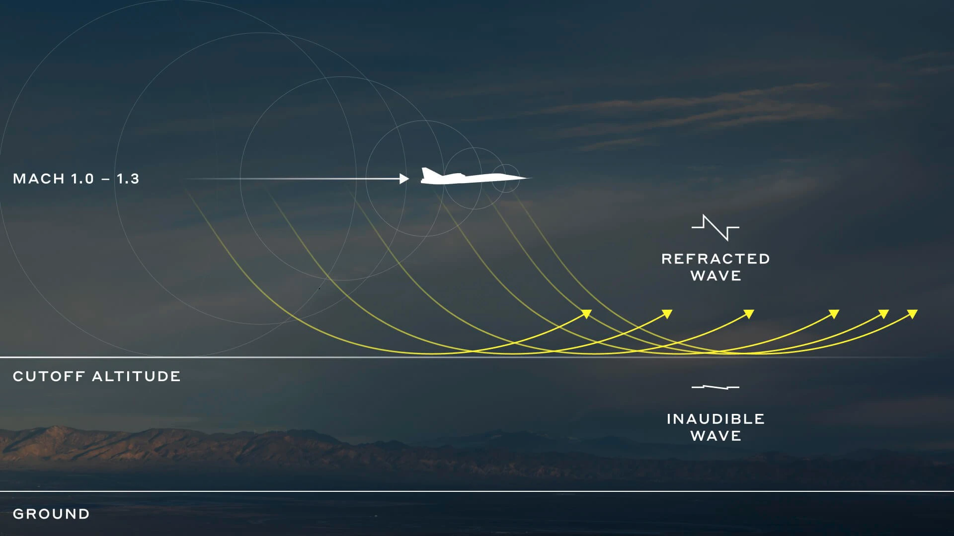 Als Mach Cutoff bezeichnet man das physikalische Phänomen einer u-förmigen Reflexion von Schallwellen oberhalb des Bodens zurück in die Atmosphäre. Ein Überschallflugzeug, das auf seinem Flug Schallwellen auslöst, die üblicherweise am Boden als Knall wahrnehmbar wären, kann so ohne für Menschen spürbaren Effekt unterwegs sein. Dazu muss das Flugzeug exakt an die jeweils herrschenden Bedingungen des überflogenen Gebiets angepasst werden. Boom-CEO Blake Scholl erklärt: „So wie sich ein Lichtstrahl beim Durchqueren eines mit Wasser gefüllten Glases bricht, verändern auch Schallwellen ihre Richtung – je nachdem, durch welche Luftschichten sie sich bewegen und wie dort die Schallgeschwindigkeit variiert.“