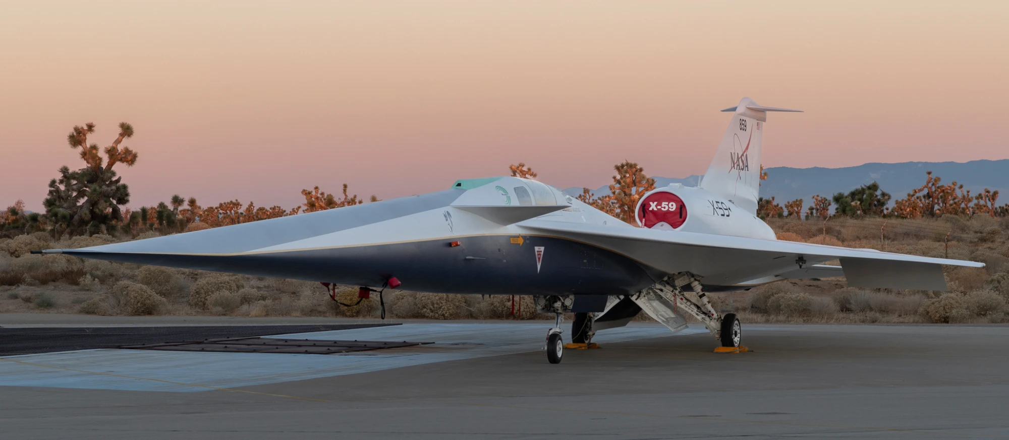 Dieses Prinzip nennt sich „Low Boom“-Technologie. Fast die Hälfte der 30,4 Meter langen X-59 entfallen auf die extrem lang gestreckte, platt gedrückte „Pinocchio-Nase“, wie Pilot:innen sie nennen. Die ungewöhnliche Form der Rumpfnase und des gesamten Deltaflüglers (Spannweite neun Meter) mit T-Leitwerk und Canards (Entenflügeln) vorne ist bewusst gewählt. So sollen die Schockwellen, die im Überschallflug für den Knall verantwortlich sind, deutlich abgeschwächt werden. Die Form des Testflugzeugs kann den Knall zwar nicht vollständig verhindern – das ist physikalisch unmöglich –, aber deutlich abschwächen. Er soll so gedämpft werden, dass das, was noch am Boden ankommt, für Mensch und Material nicht lauter als eine zuschlagende Autotür und damit leicht auszuhalten ist.
