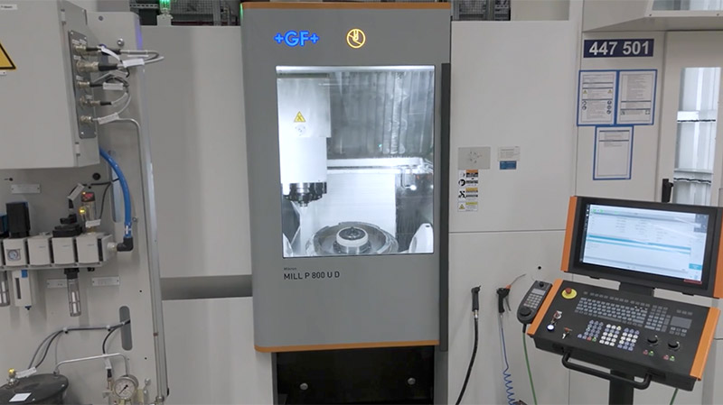 Auch der Fräsvorgang findet in Form eines Closed-Door-Prozesses statt, ohne dass ein Eingreifen von Mitarbeiter:innen erforderlich ist. Der Werkzeugwechsel erfolgt ebenso durch Roboter.