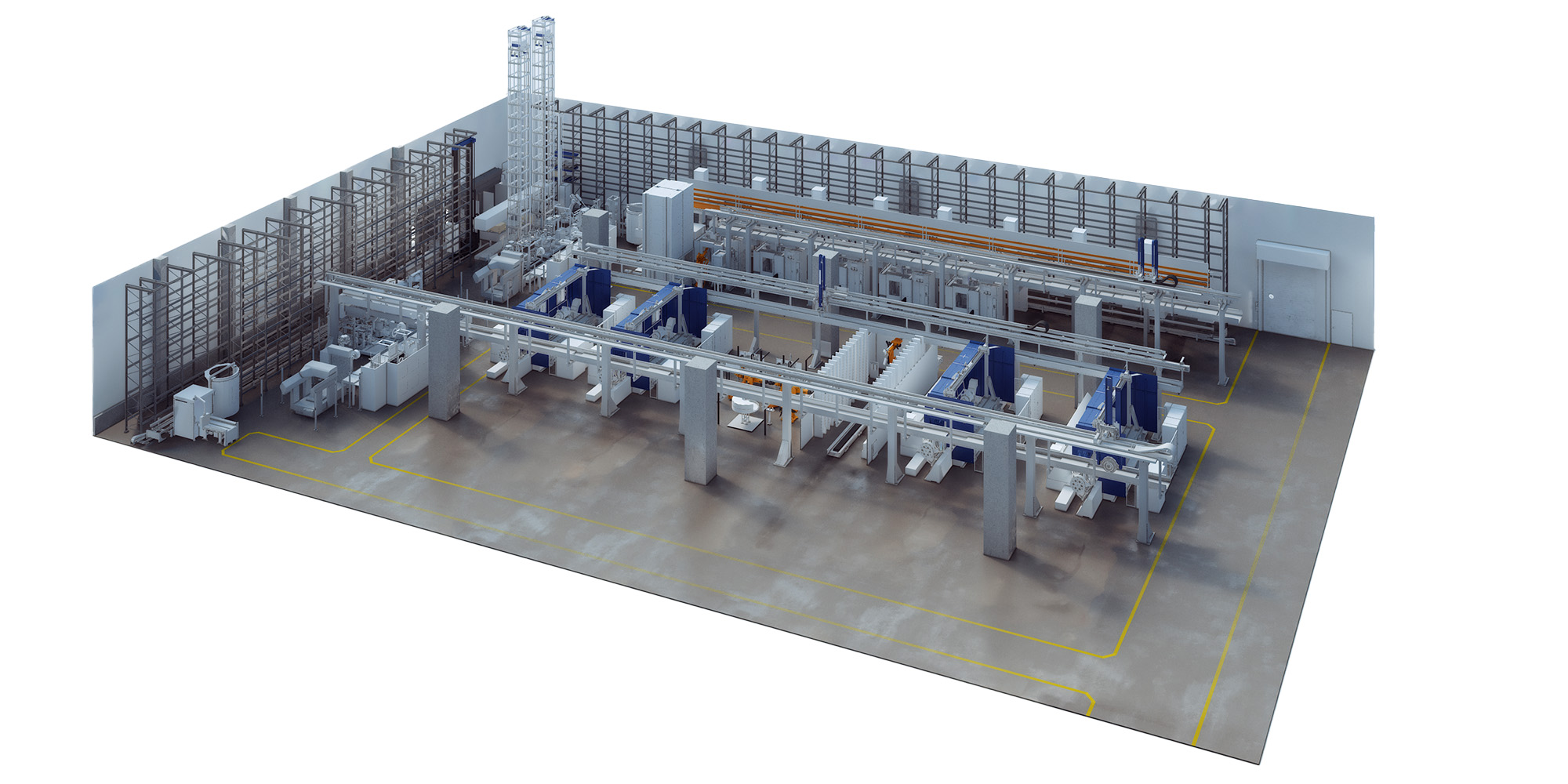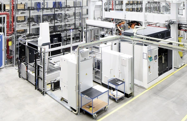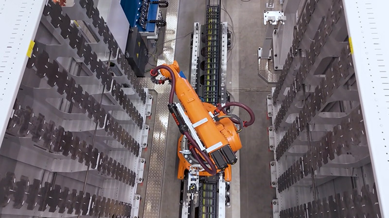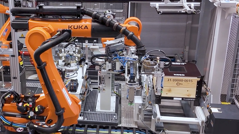 Das Werkstück gelangt nach dem Räumen in einer anderen Produktionshalle per fahrerlosen Transportsystems zurück in die Fertigungslinie. Dort wird es ebenfalls per Roboter in den entsprechenden Bauteil- und Vorrichtungsspeicher abgelegt.