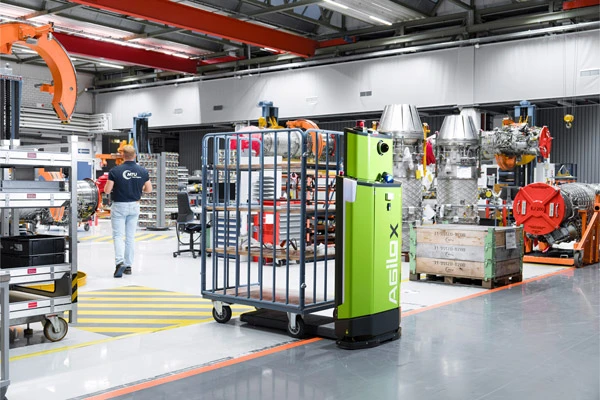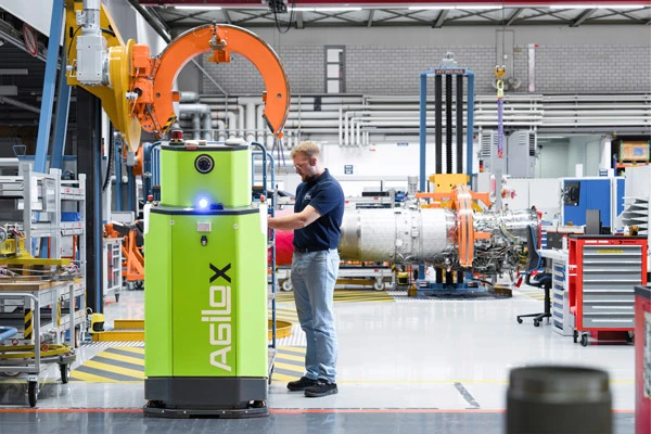 Das alles galt es zu berücksichtigen, als Schmuttermayr und sein Team 2020 das erste FTS-Projekt in der Intralogistik bei der MTU in München starteten. Die Intralogistik umfasst sämtliche logistischen Material- und Warenflüsse innerhalb des Werksgeländes. Ziel war es, die innerbetrieblichen Transporte so zu optimieren, dass Materialfluss und Produktion noch effizienter werden. Das Projekt begann mit umfangreichen Tests von fahrerlosen Transportsystemen verschiedener Hersteller. Schließlich erhielt das FTS des österreichischen Start-ups Agilox den Zuschlag.