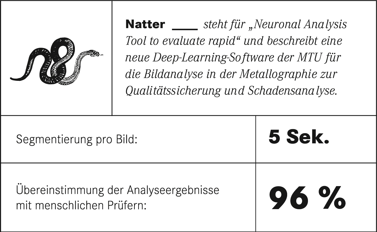 Wer Julian von Lautz und Dr. Hendrik Kramer bei einem Arbeitsgespräch oberflächlich zuhört, könnte durchaus auf die Idee kommen, dass die beiden Ingenieure gerade einen Besuch im Reptilien-Zoo planen. Da fallen Namen wie „Python“ und „Anaconda“, und immer wieder erwähnen sie auch eine „Natter“ – die sehr schnell sein soll. Informatiker wissen bereits bei den ersten beiden Stichworten, dass es sich hier nicht um Schlangen, sondern um die Programmiersprache „Python“ und dessen Toolkit „Anaconda“ handelt. Aber „Natter“? „Steht für ‚Neuronal Analysis Tool to evaluate rapid‘ und beschreibt eine neue Deep-Learning-Software, die die Bildanalyse in der Metallographie zur Werkstoffentwicklung, Qualitätsprüfung und Schadensanalyse auf ein vollkommen neues Level hebt“, klärt Dr. Hendrik Kramer auf, der in dem Team Werkstoffanalytik/Metallografie bei der MTU Aero Engines in München unter anderem für die Bildanalyse zuständig ist. Der Werkstoffexperte hat Natter zusammen mit Julian von Lautz, bisher Leiter der Schadensanalyse, und weiteren Kollegen von der Idee in die Anwendung gebracht. „Zugegeben, wir hatten erst den Namen Natter, dann haben wir die Beschreibung dazu gebastelt.“