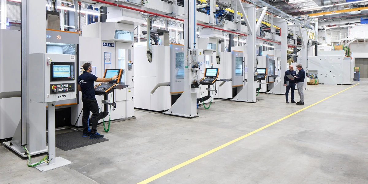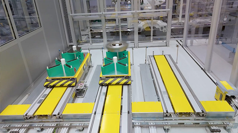 Grundsätzlich durchläuft ein Bauteil die Prüfstelle zweimal – einmal zur Zwischen- und einmal zur Schlussprüfung. Nachdem die Scheiben eine Etage tiefer gedreht und gefräst wurden, bringt ein eigens dafür entwickeltes Transportsystem sie über einen Aufzug nach oben in die Prüfstelle. Der RFID-Chip an der Transportkiste zeigt an, um welches Bauteil es sich handelt. Über Kettenförderer und Förderbänder kommt jedes Bauteil automatisch in das Regalsystem. Bis zu 274 Turbinenscheiben können dort gleichzeitig gelagert werden.