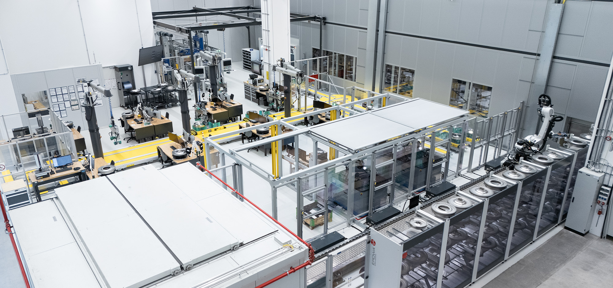 Geht man mit MTU-Projektplaner Martin Gschwendtner durch die Prüfstelle der Turbinenscheibenfertigung der MTU in München, ist man überrascht über die Ruhe. Viele Mitarbeiter:innen sind nicht zu sehen, lediglich ein eCart fährt mit einem Bauteil herum. „Running Sushi“ nennt das Team liebevoll das Transportsystem, das die Turbinenscheiben zur finalen Sichtprüfung an die Arbeitsplätze der Mitarbeiter:innen bringt. Die 900 Quadratmeter große Prüfstelle, die im Sommer 2024 eröffnet wurde, ist in ihrem Automatisierungs- und Digitalisierungsgrad weltweit einmalig. „Die Maschinen können rund um die Uhr vollautomatisch laufen“, berichtet Gschwendtner.