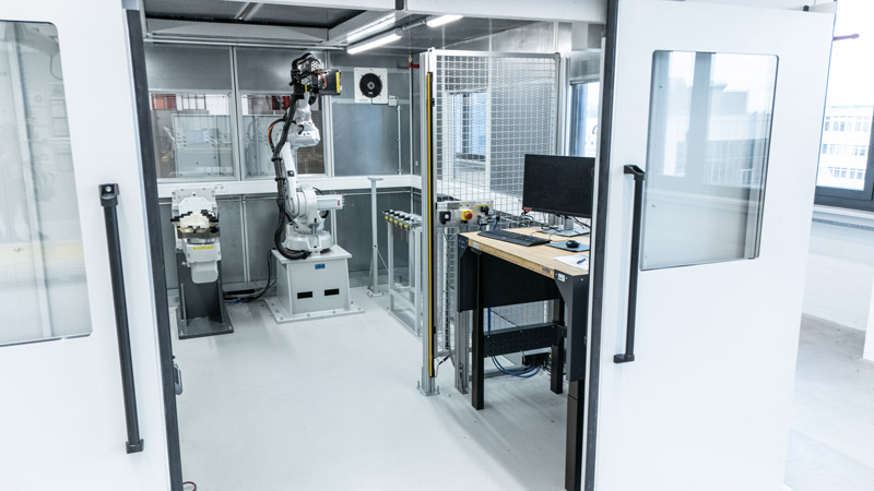 Obwohl das Bauteil bereits seine eingravierte Seriennummer hat, erhält es im nächsten Schritt in einer separaten Zelle noch ein zuvor auf dem Koordinatenmessgerät erfasstes Maß. Dieses Maß hilft später bei der Instandhaltung, Abweichungen zu erkennen - auch hier agiert der Roboter autonom und führt das Bauteil ohne menschliches Zutun.