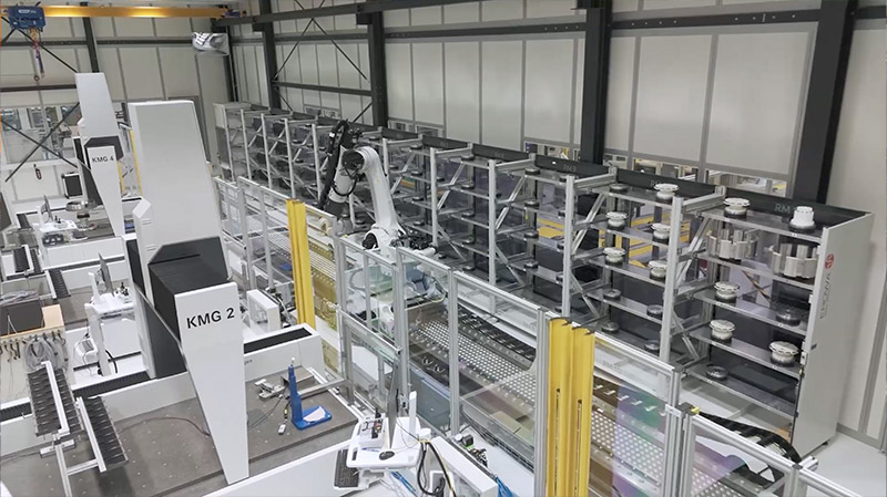 Für die Bearbeitung auf dem Koordinatenmessgerät fordert das Prüfstellenleitsystem das Bauteil automatisch im Regalsystem an. Der Roboter stellt hierfür automatisch die richtige Vorrichtung bereit. Innerhalb weniger Minuten wird das Bauteil dann durch einen Mitarbeiter manuell aufgerüstet. Die menschliche Zuarbeit ist hier essentiell, da der Mitarbeiter beim Aufrüsten das Bauteil auf Verschmutzungen durch den Transport untersucht.