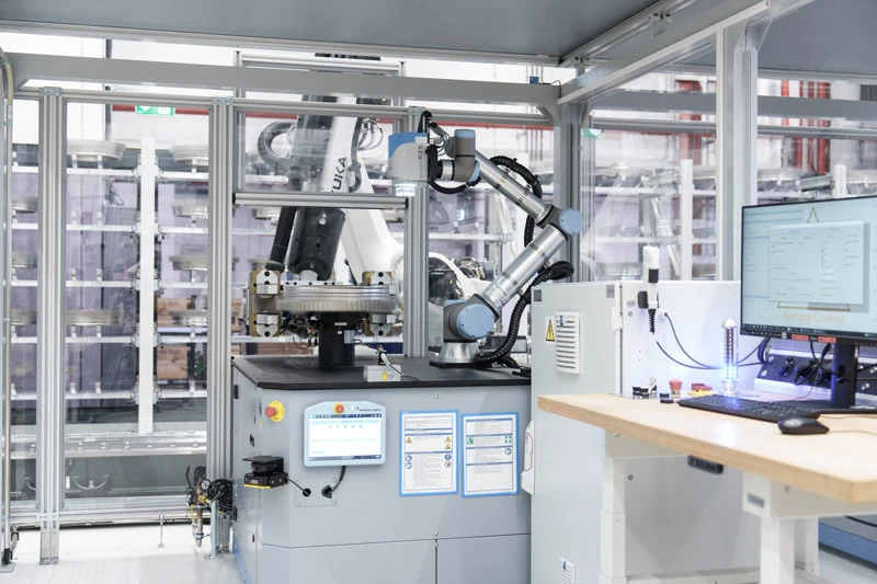 Sobald das Bauteil im Regalsystem eingelagert ist, kann das Leitsystem der Prüfstelle die Kiste mit dem Bauteil für den Prüfvorgang anfordern, währenddessen bringt der Roboter automatisch die passende Vorrichtung. Innerhalb weniger Minuten rüstet ein Mitarbeiter das Bauteil auf. Bis zu vier Stunden dauert dagegen der Prüfvorgang an der Maschine, der in der Regel ohne menschliches Zutun auskommt. Danach entnimmt der Roboter das Bauteil wieder automatisch aus der Messmaschine, die sich dem nächsten Werkstück widmet. In einer separaten Zelle erfolgt die Kennzeichnung. Dort wird das Bauteil mit einem Maß versehen. Dieses hilft später in der Instandhaltung, Abweichungen zu erkennen. Auch hier führt der Roboter das Bauteil automatisch zu. Anschließend wird die Turbinenscheibe auf ein optisches Messgerät gebracht. Dort prüft ein kollaborativer Roboterarm mit einem 3D-Messsensor diverse Radien und Kanten.