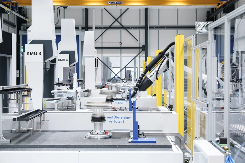 Per Roboter gelangt die Turbinenscheibe in das Koordinatenmessgerät. Dort wird sie bis zu vier Stunden lang von allen Seiten vermessen und anschließend wieder automatisch vom Roboter entladen. Je nach Qualität des Bauteils können die Prüfabläufe variieren.