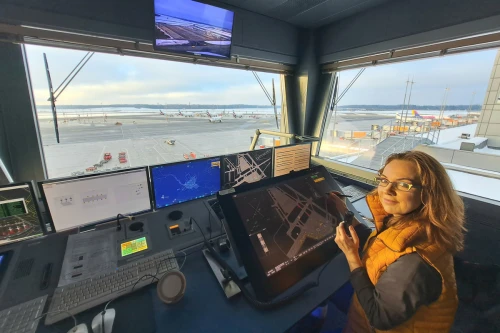 Vom Aussichtsrestaurant im Obergeschoss des Hamburger Flughafens, wo Reisende und Besucher:innen sich am Büffet bedienen, sind es nur ein paar spezialgesicherte Türen in eines der Herzstücke des Flughafenbetriebs. Die Vorfeldkontrolle bietet die beste Aussicht auf das Flughafengelände, ähnlich einer Schiffskommandobrücke, mit Scheibenwischern für klare Sicht bei schlechtem Wetter. Hier arbeitet seit 30 Jahren Natalie Lüth. Die 54-jährige Hamburgerin wollte nach ihrer Ausbildung zur Fluglotsin in ihrer Heimatstadt bleiben und nicht nach Frankfurt ziehen. „Bei der Deutschen Flugsicherung (DFS) hätte ich wegziehen müssen, deshalb habe ich meinen Arbeitgeber gewechselt und 1994 beim Hamburger Flughafen als Vorfeldlotsin angefangen,“ erzählt sie. Ihr Arbeitsfeld ist die Apron Control, der flughafeneigene Kontrollturm, der den Verkehr auf dem Vorfeld überwacht und den Flugzeugen Rollwege und Parkpositionen zuweist. Gerade zu Spitzenzeiten kann es dort eng werden. Effiziente Abläufe sind Voraussetzung, um die Infrastruktur des Flughafens optimal zu nutzen.