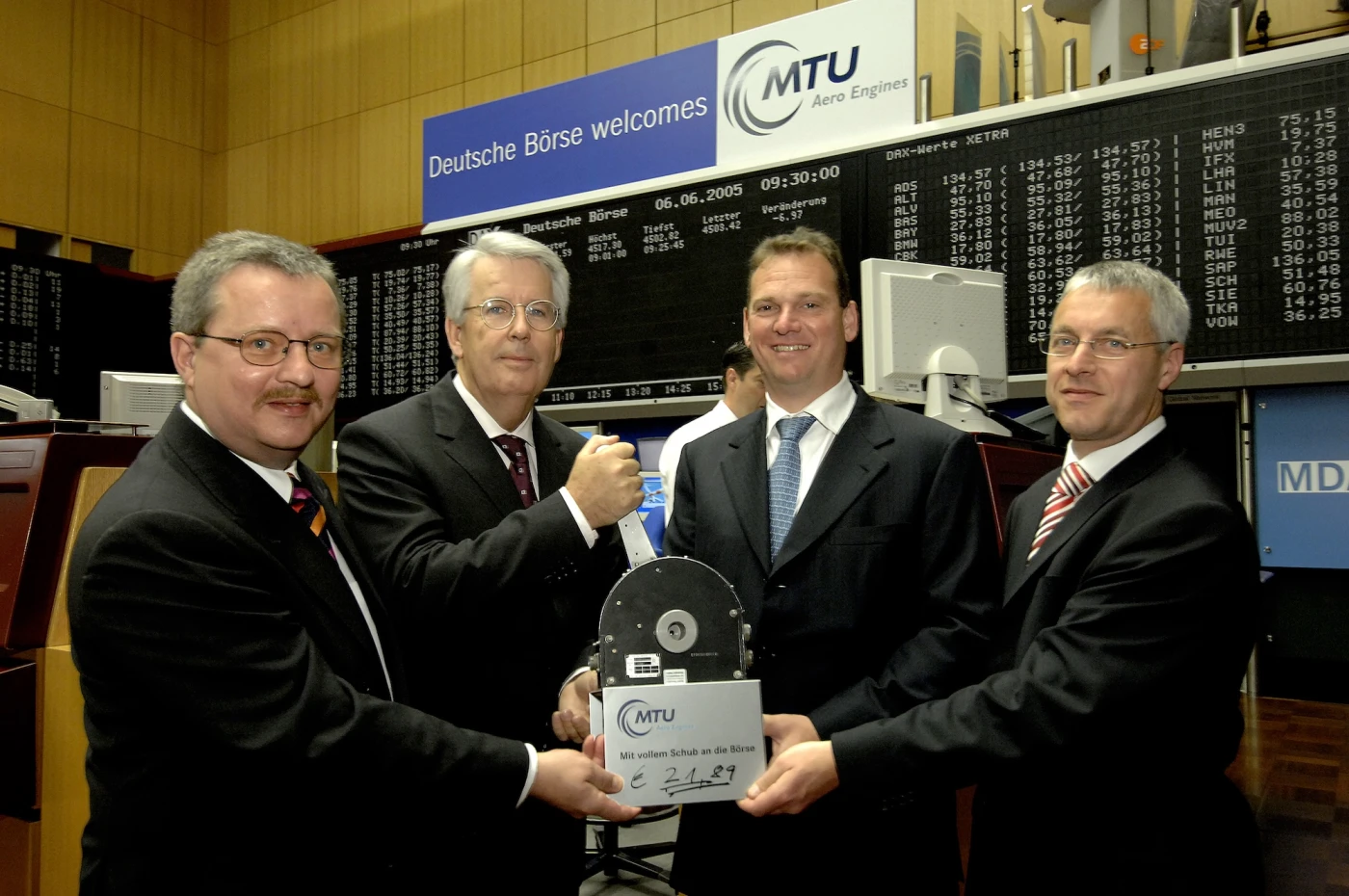 Der Vorstand der MTU Aero Engines Holding AG mit dem Schubhebel auf dem Parkett der Frankfurter Börse.