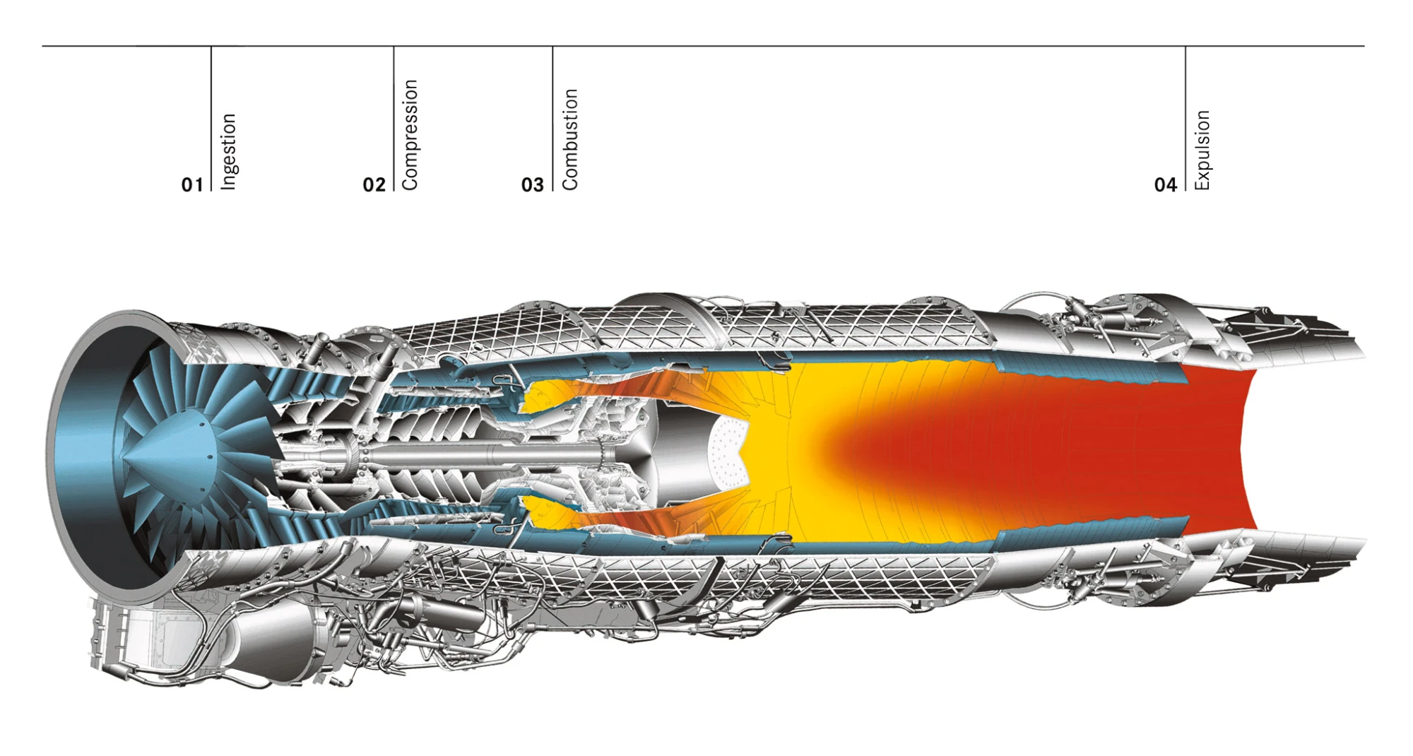 After the air has been ingested, it first flows through the low-pressure compressor and then through the high-pressure compressor. Each stage compresses the air further, increasing its pressure and temperature. This compression is essential to maximize the efficiency of the subsequent combustion and thus generate greater thrust.