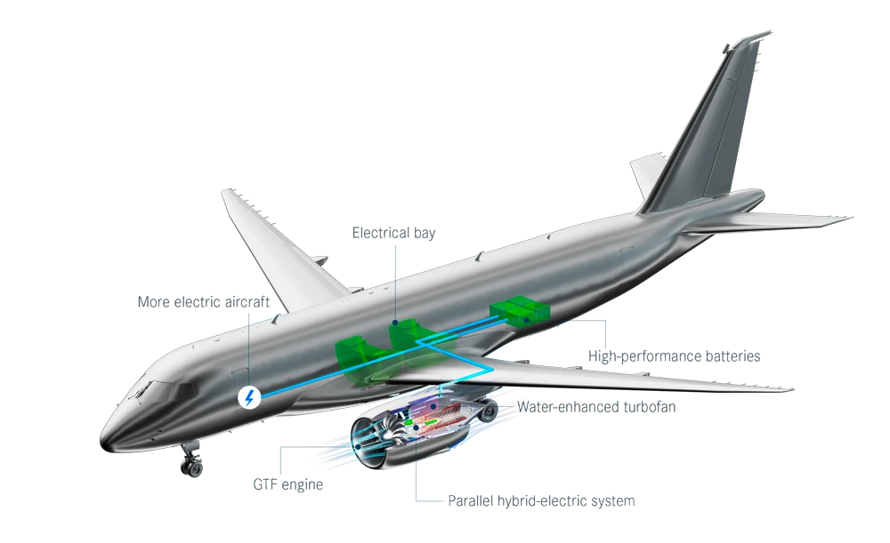 Hybrid-electric and Water-Enhanced Turbofan technologies: SWITCH combines two technologies: MTU's Water-Enhanced Turbofan concept (WET) and hybrid-electric propulsion elements. The basis is Pratt & Whitney's GTFTM engine.